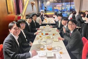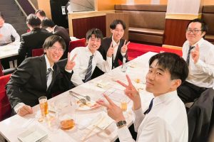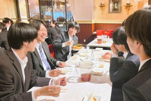 入社式から新入社員研修の3日間、慣れない環境で続いた緊張から解放された様子で、美味しい料理を囲みながら会場内は終始明るい笑い声に包まれていました。